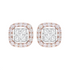 These luxurious solitaire earrings feature a brilliant cushion-cut lab grown diamond as their radiant centerpiece. Each main lab grown diamond is meticulously set within a rich, rose gold frame, which is then surrounded by a dazzling single halo of smaller, pave-set round lab grown diamonds. The combination of the cushion cut's classic appeal with the warm glow of the rose gold and the sparkling halo creates a timeless yet opulent design. The meticulous setting ensures maximum light reflection from all lab grown diamonds, making these earrings a sophisticated and eye-catching accessory.